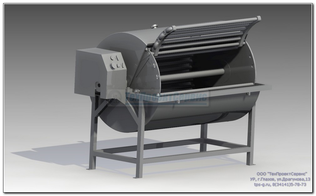 - загрузочно-разгрузочное окно на всю ширину барабана, что значительно упрощает загрузку и выгрузку мешочков, дает возможность загружать и разгружать барабан в несколько потоков и с разных направлений и располагать мешочки при загрузке равномерно по всей ширине барабана, что значительно увеличивает эффективность их прессования и охлаждения;